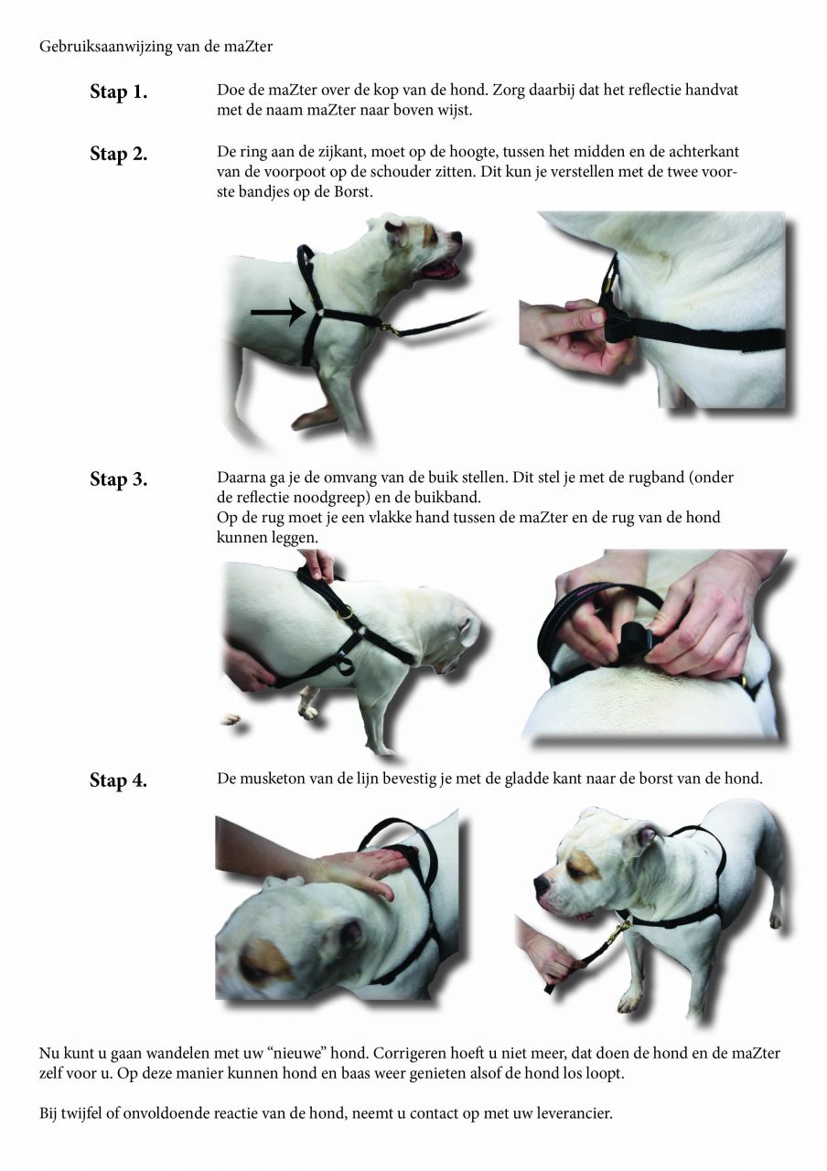 De maZter hondentuig/anti-trekuig corrigeert uw hond vanuit irritatie op een zenuwbaan op de schouder en met dis-balans. En niet zoals vele anti trektuigen met pijn en verwurging.De maZter is een positief hulpmiddel waarbij de hond op de juiste manier en het juiste moment wordt gecorrigeerd. Eigenaar en hond genieten weer van het uitlaten en het wandelen. Let op: gebruikt u het tuig als anti-trek tuig, bevestig altijd de lijn aan de voorkant (op de borst)